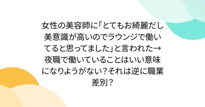女性の美容師に「とてもお綺麗だし美意識が高いのでラウンジで働いてると思ってました」と言われた→夜職で働いていることはいい意味になりようがない?それは逆に職業差別?