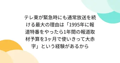 テレ東が緊急時にも通常放送を続ける最大の理由は「1995年に報道特番をやったら1年間の報道取材予算を3ヶ月で使いきって大赤字」という経験があるから