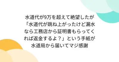 水道代が9万を超えて絶望したが「水道代が跳ね上がったけど漏水なら工務店から証明書もらってくれば返金するよ?」という手紙が水道局から届いてマジ感謝