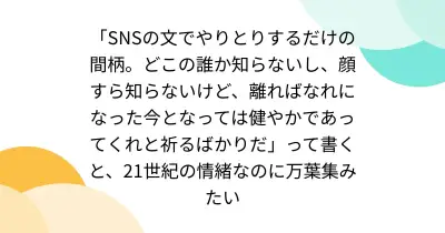 「SNSの文でやりとりするだけの間柄。どこの誰か知らないし、顔すら知らないけど、離ればなれになった今となっては健やかであってくれと祈るばかりだ」って書くと、21世紀の情緒なのに万葉集みたい