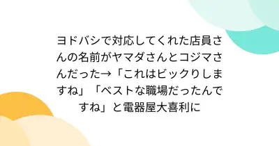 ヨドバシで対応してくれた店員さんの名前がヤマダさんとコジマさんだった→「これはビックりしますね」「ベストな職場だったんですね」と電器屋大喜利に