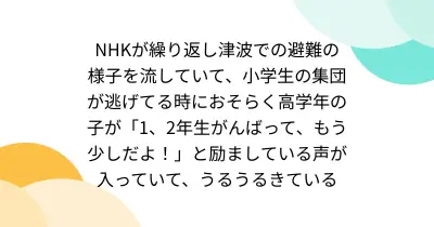 NHKが繰り返し津波での避難の様子を流していて、小学生の集団が逃げてる時におそらく高学年の子が「1、2年生がんばって、もう少しだよ!」と励ましている声が入っていて、うるうるきている