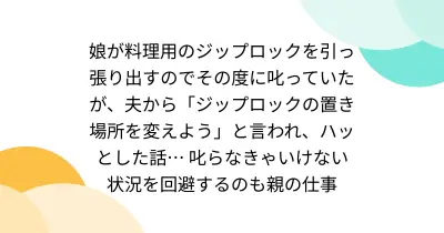 娘が料理用のジップロックを引っ張り出すのでその度に叱っていたが、夫から「ジップロックの置き場所を変えよう」と言われ、ハッとした話… 叱らなきゃいけない状況を回避するのも親の仕事