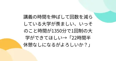 講義の時間を伸ばして回数を減らしている大学が羨ましい、いっそのこと時間が1350分で1回制の大学ができてほしい→「22時間半休憩なしになるがよろしいか?」