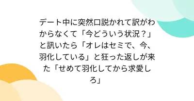 デート中に突然口説かれて訳がわからなくて「今どういう状況?」と訊いたら「オレはセミで、今、羽化している」と狂った返しが来た「せめて羽化してから求愛しろ」