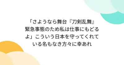「さようなら舞台『刀剣乱舞』 緊急事態のため私は仕事にもどるよ」こういう日本を守ってくれている名もなき方々に幸あれ