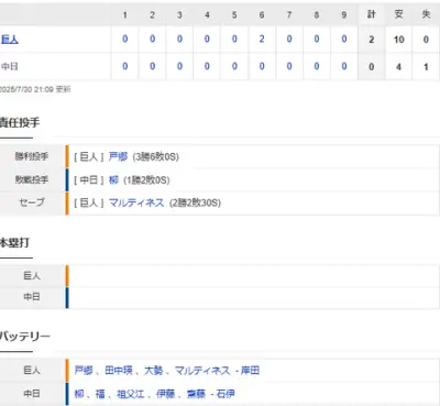 【試合結果】 7/30 中日 0-2 巨人 柳6回2失点も打線4安打で完封負け・・