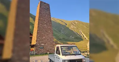 山口県宇部市の岡本工務店さんへ「あなたが愛した軽トラは遠く離れたジョージアの中世の石塔が残る人口6人の村で元気に愛され活躍しています」