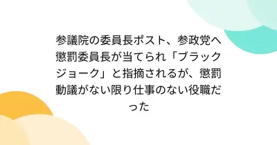 参議院の委員長ポスト、参政党へ懲罰委員長が当てられ「ブラックジョーク」と指摘されるが、懲罰動議がない限り仕事のない役職だった