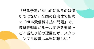 「見る予定がないのに払うのは適切ではない」全国の自治体で相次ぐ「NHK受信料未払い問題」で、岐阜県知事がルール変更を要望…ごく当たり前の理屈だが、スクランブル放送は本当に難しい?