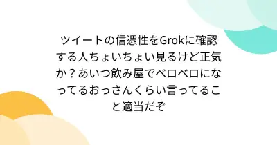 ツイートの信憑性をGrokに確認する人ちょいちょい見るけど正気か?あいつ飲み屋でベロベロになってるおっさんくらい言ってること適当だぞ