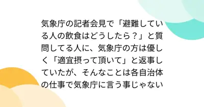 気象庁の記者会見で「避難している人の飲食はどうしたら?」と質問してる人に、気象庁の方は優しく「適宜摂って頂いて」と返事していたが、そんなことは各自治体の仕事で気象庁に言う事じゃない