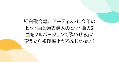 紅白歌合戦、「アーティストに今年のヒット曲と過去最大のヒット曲の2曲をフルバージョンで歌わせる」に変えたら視聴率上がるんじゃない?