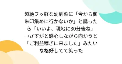 超絶フッ軽な幼馴染に「今から御朱印集めに行かないか」と誘ったら「いいよ、現地に30分後ね」→さすがと感心しながら向かうと「ご利益稼ぎに来ました」みたいな格好してて笑った
