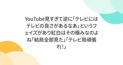 YouTube見すぎて逆に「テレビにはテレビの良さがあるなあ」というフェイズがあり紅白はその極みなのよね「結局全部見た」「テレビ局頑張れ!」
