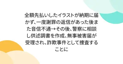 全額先払いしたイラストが納期に届かず、一度謝罪の返信があった後また音信不通→その後、警察に相談し供述調書を作成、無事被害届が受理され、詐欺事件として捜査することに