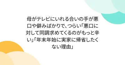 母がテレビにいれる合いの手が悪口や僻みばかりで、つらい「悪口に対して同調求めてくるのがもっと辛い」「年末年始に実家に帰省したくない理由」