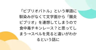 「ビブリオバトル」という単語に馴染みがなくて文字面から「腸炎ビブリオ」を連想してしまうので食中毒チキンレース?と思ってしまう→スペルを見ると違いがわかるという話に