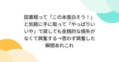 図書館って「この本面白そう!」と気軽に手に取って「やっぱりいいや」で戻しても金銭的な損失がなくて興奮する→思わず興奮した瞬間あれこれ