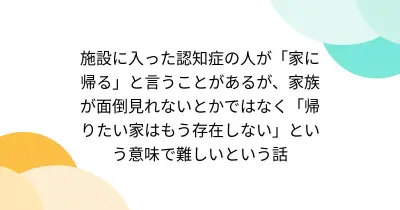施設に入った認知症の人が「家に帰る」と言うことがあるが、家族が面倒見れないとかではなく「帰りたい家はもう存在しない」という意味で難しいという話
