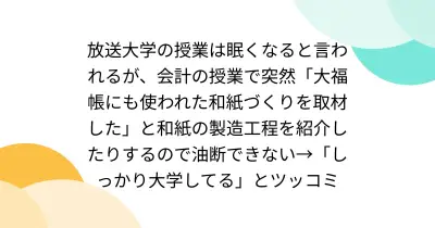 放送大学の授業は眠くなると言われるが、会計の授業で突然「大福帳にも使われた和紙づくりを取材した」と和紙の製造工程を紹介したりするので油断できない→「しっかり大学してる」とツッコミ