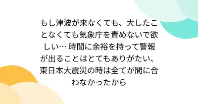もし津波が来なくても、大したことなくても気象庁を責めないで欲しい… 時間に余裕を持って警報が出ることはとてもありがたい、東日本大震災の時は全てが間に合わなかったから