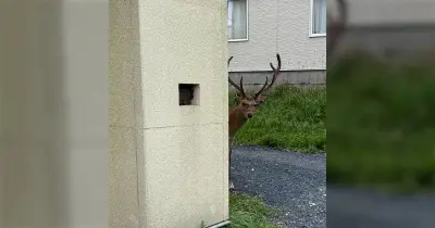 「出勤しようとしたらこれよ」角から現れたシカと目がばっちり合う瞬間を激写→シカのセリフで大喜利へ「シカッターがあったらシカも呟いてる」