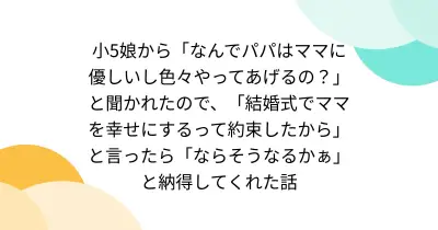 小5娘から「なんでパパはママに優しいし色々やってあげるの?」と聞かれたので、「結婚式でママを幸せにするって約束したから」と言ったら「ならそうなるかぁ」と納得してくれた話