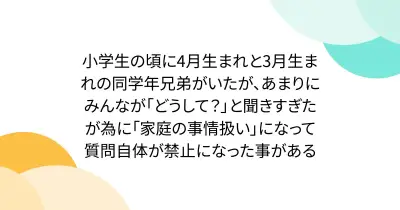 小学生の頃に4月生まれと3月生まれの同学年兄弟がいたが、あまりにみんなが「どうして?」と聞きすぎたが為に「家庭の事情扱い」になって質問自体が禁止になった事がある
