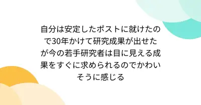 自分は安定したポストに就けたので30年かけて研究成果が出せたが今の若手研究者は目に見える成果をすぐに求められるのでかわいそうに感じる