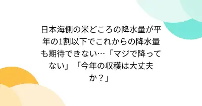 日本海側の米どころの降水量が平年の1割以下でこれからの降水量も期待できない…「マジで降ってない」「今年の収穫は大丈夫か?」