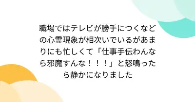 職場ではテレビが勝手につくなどの心霊現象が相次いでいるがあまりにも忙しくて「仕事手伝わんなら邪魔すんな!!!」と怒鳴ったら静かになりました