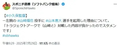 小久保監督、左腕の山崎福也に山本恵大を起用した理由について「トラジェクトアークで(山崎と)対戦した内容が良かったのでスタメンです」