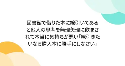図書館で借りた本に線引いてあると他人の思考を無理矢理に飲まされて本当に気持ちが悪い「線引きたいなら購入本に勝手にしなさい」