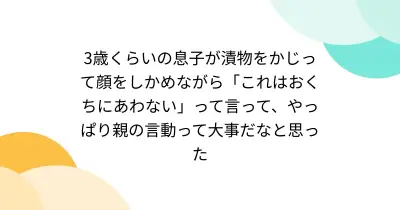 3歳くらいの息子が漬物をかじって顔をしかめながら「これはおくちにあわない」って言って、やっぱり親の言動って大事だなと思った