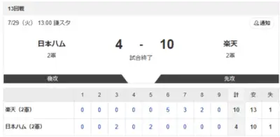 【2軍 日本ハムvs.楽天】4-10で敗北