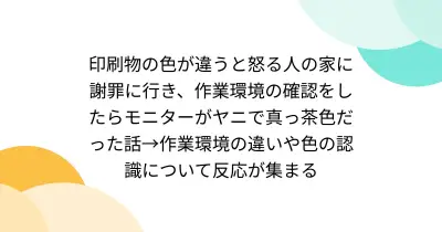 印刷物の色が違うと怒る人の家に謝罪に行き、作業環境の確認をしたらモニターがヤニで真っ茶色だった話→作業環境の違いや色の認識について反応が集まる