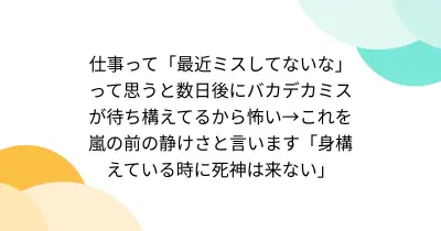 仕事って「最近ミスしてないな」って思うと数日後にバカデカミスが待ち構えてるから怖い→これを嵐の前の静けさと言います「身構えている時に死神は来ない」