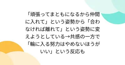 「頑張ってまともになるから仲間に入れて」という姿勢から「合わなければ離れて」という姿勢に変えようとしている→共感の一方で「輪に入る努力はやめないほうがいい」という反応も