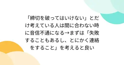 「締切を破ってはいけない」とだけ考えている人は間に合わない時に音信不通になる→まずは「失敗することもあるし、とにかく連絡をすること」を考えると良い