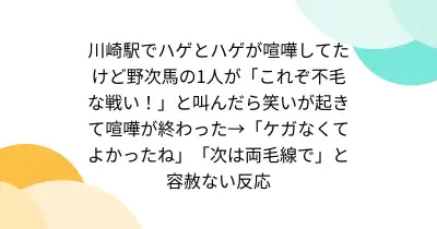 川崎駅でハゲとハゲが喧嘩してたけど野次馬の1人が「これぞ不毛な戦い!」と叫んだら笑いが起きて喧嘩が終わった→「ケガなくてよかったね」「次は両毛線で」と容赦ない反応