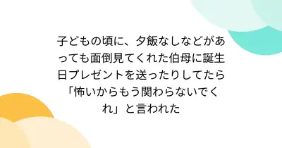 子どもの頃に、夕飯なしなどがあっても面倒見てくれた伯母に誕生日プレゼントを送ったりしてたら「怖いからもう関わらないでくれ」と言われた
