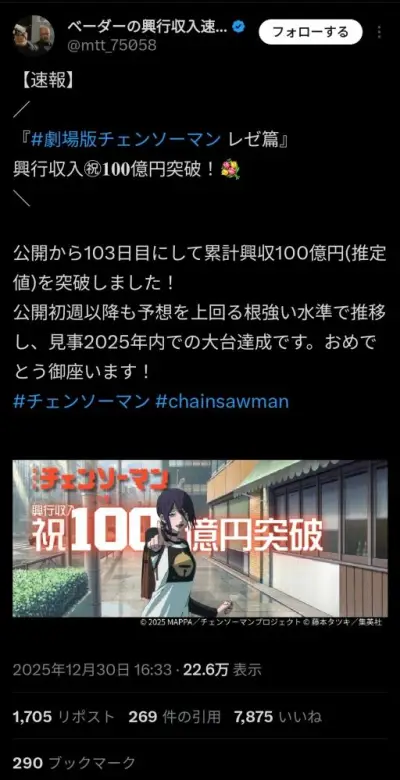 【祝】劇場版「チェンソーマン レゼ篇」、ついに興行収入100億円を突破した模様!!!
