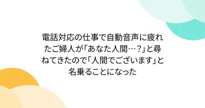 電話対応の仕事で自動音声に疲れたご婦人が「あなた人間…?」と尋ねてきたので「人間でございます」と名乗ることになった