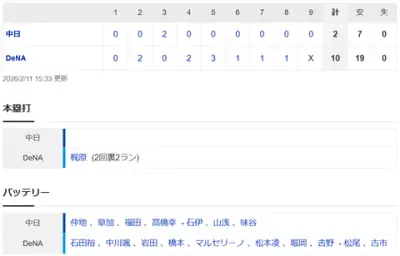 【試合結果】[2026/2/11] DeNAベイスターズ10-2中日ドラゴンズ 】相川監督 初陣飾る 初対外試合は中日に大勝!毎回の19安打10得点