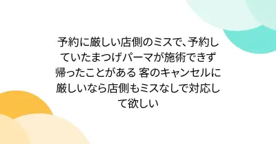 予約に厳しい店側のミスで、予約していたまつげパーマが施術できず帰ったことがある 客のキャンセルに厳しいなら店側もミスなしで対応して欲しい