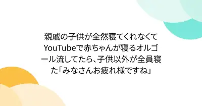 親戚の子供が全然寝てくれなくてYouTubeで赤ちゃんが寝るオルゴール流してたら、子供以外が全員寝た「みなさんお疲れ様ですね」