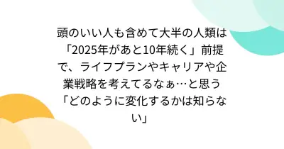 頭のいい人も含めて大半の人類は「2025年があと10年続く」前提で、ライフプランやキャリアや企業戦略を考えてるなぁ…と思う「どのように変化するかは知らない」