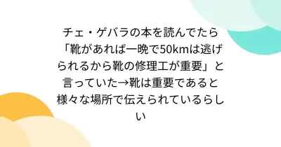チェ・ゲバラの本を読んでたら「靴があれば一晩で50kmは逃げられるから靴の修理工が重要」と言っていた→靴は重要であると様々な場所で伝えられているらしい