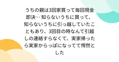 うちの親は3回家買って毎回現金即決… 知らないうちに買って、知らないうちに引っ越していたこともあり、3回目の時なんて引越しの連絡すらなくて、実家帰ったら実家からっぽになってて愕然とした